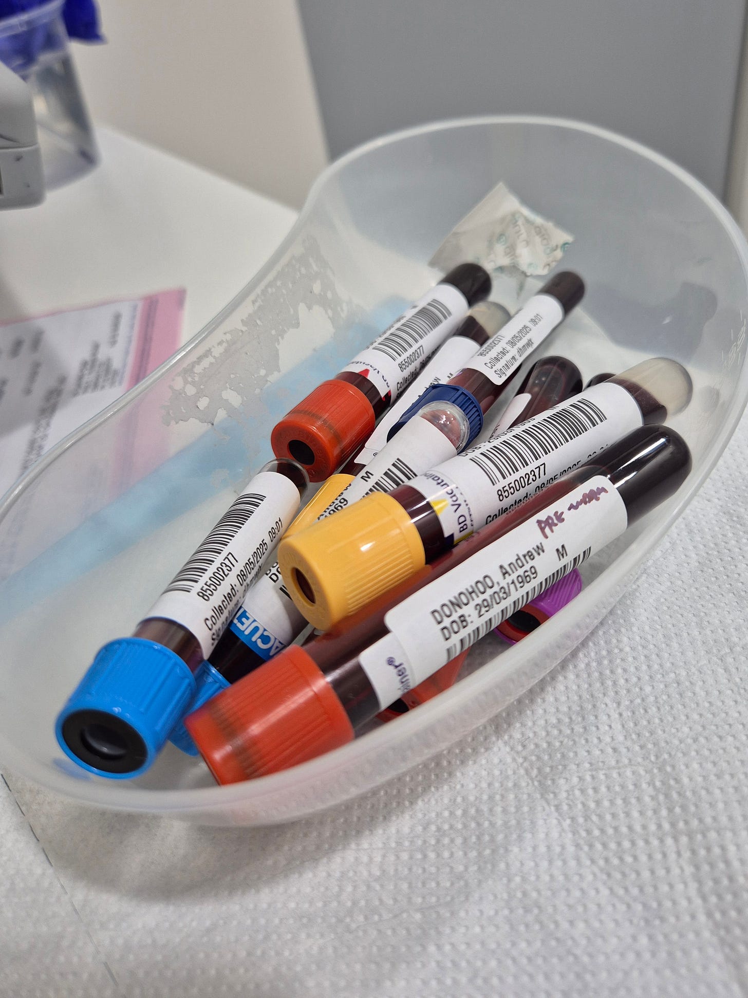 Feeling quite healthy at the time I first suspected my health was amiss the day my GP requested the dozen or so vials of blood pictured above. Needle number one led to others. A quick count tells me I have had 34 since the end of April.